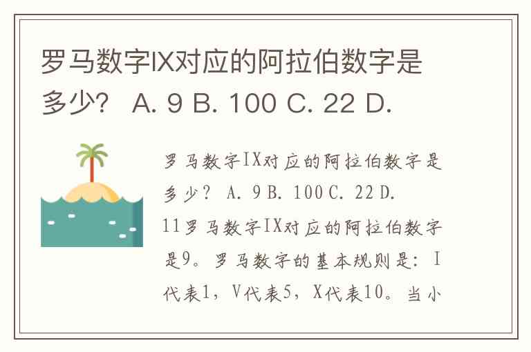 罗马数字IX对应的阿拉伯数字是多少? A. 9 B. 100 C. 22 D. 11