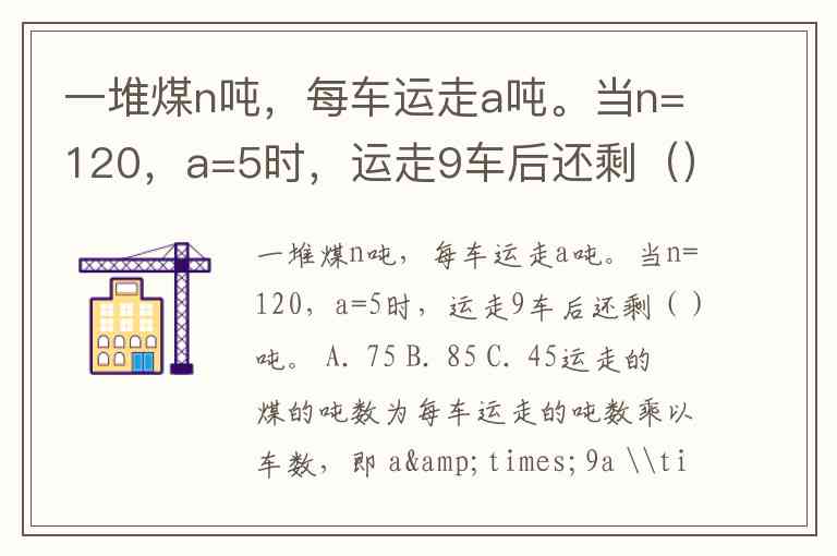 一堆煤n吨,每车运走a吨。当n=120,a=5时,运走9车后还剩()吨。 A. 75 B. 85 C. 45