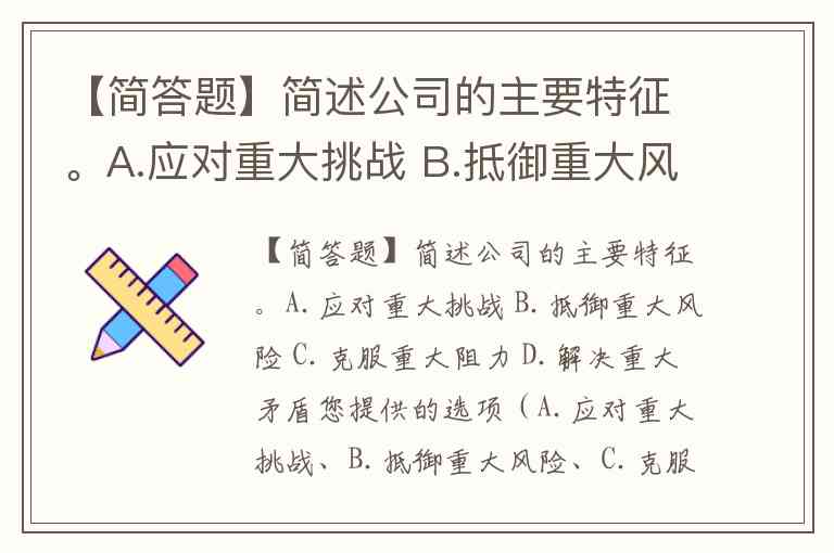 【简答题】简述公司的主要特征。A.应对重大挑战 B.抵御重大风险 C.克服重大阻力 D.解决重大矛盾