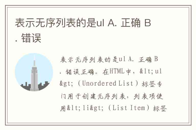 正确。在HTML中,<ul>(Unordered List)标签专门用于创建无序列表,列表项使用<li>(List Item)标签定义,默认显示为带项目符号的列表。与有序列表<ol>(Ordered List)不同,无序列表不强调项目的顺序,常见于展示并列关系的内容,如导航菜单、功能特性列表等。
