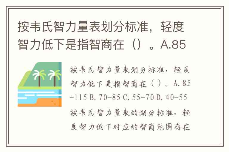 按韦氏智力量表的划分标准,轻度智力低下对应的智商范围存在微小差异但核心区间明确。主流标准将其界定为 50~69分(或部分表述为55~70分),这一范围的个体通常能掌握基本生活技能,但学习和抽象思维能力存在明显局限。