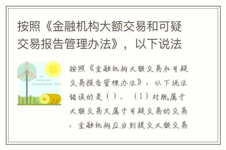 按照《金融机构大额交易和可疑交易报告管理办法》,以下说法错误的是()。 (1)对既属于大额交易又属于可疑交易的交易,金融机构应分别提交大额交易报告和可疑交易报告 (2)对既属于大额交易又属于可疑交易的交易,金融机构只需提交可疑交易报告 (3)交易同时符合两项以上大额交易标准的,金融机构应当分别提交大额交易报告 (4)交易同时符合两项以上大额交易标准的,金融机构只需提交其中一项大额交易报告A.(1)(3) B.(2)(4) C.(1) D.(3)
