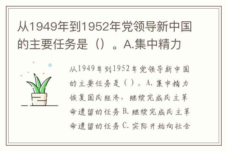从1949年到1952年党领导新中国的主要任务是()。A.集中精力恢复国民经济,继续完成民主革命遗留的任务 B.继续完成民主革命遗留的任务 C.实际开始向社会主义的过渡 D.集中精力恢复国民经济