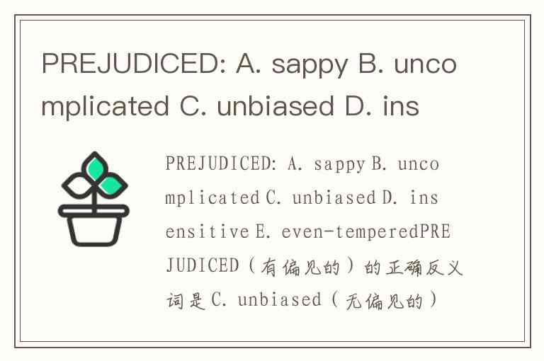 PREJUDICED(有偏见的)的正确反义词是 C. unbiased(无偏见的)。