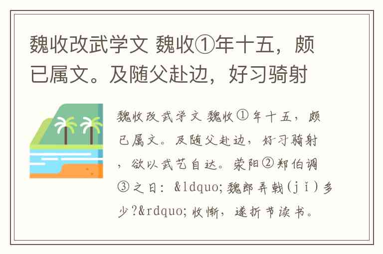 魏收改武学文 魏收①年十五,颇已属文。及随父赴边,好习骑射,欲以武艺自达。荥阳②郑伯调③之日:“魏郎弄戟(jǐ)多少?”收惭,遂折节读书。夏月④,坐板床,随树阴讽诵⑤,积年,板床为之锐减,而精力不辍。以文华显。 (选自《北齐书•魏收传》 [注释] ①魏收:北齐人。②荥(xíng)阳:古地名,在今河南境内。③调:嘲笑。(④夏月:夏季。⑤讽诵:背诵。 【思考与练习】 1.解释:①及__________②辍_________ 2.翻译:①颇已属文_______________________; ②欲以武艺自达___________________; ③积年,板床为之锐减________________________; ④以文华显______________________ 3.“遂折节读书”有以下理解,哪一项是正确的?_______ ①就改变志向努力读书; ②因此跟随别人读书; ③于是埋头读书; ④就斩断兵器致力读书。