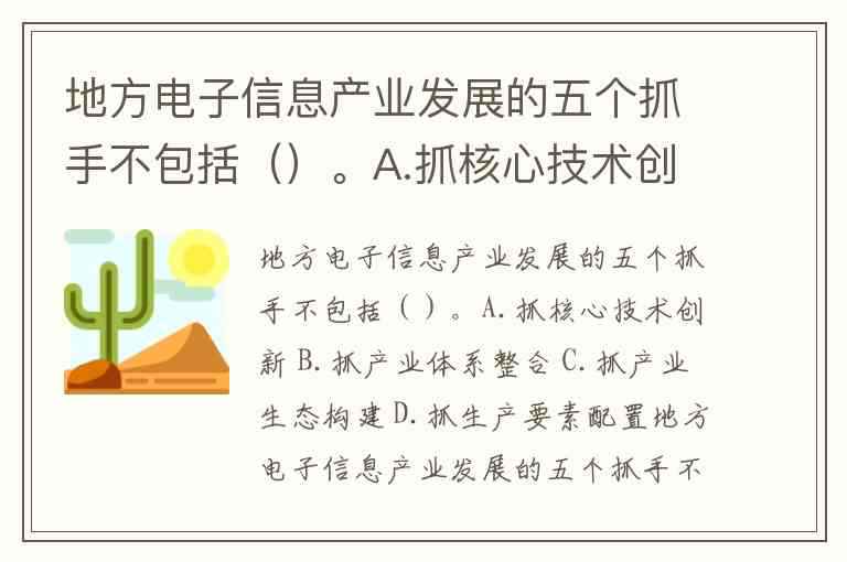 地方电子信息产业发展的五个抓手不包括D.抓生产要素配置。从多地实践看,核心抓手集中在技术创新、产业链整合、生态构建等维度,而生产要素配置多作为支撑性举措融入其他工作中。