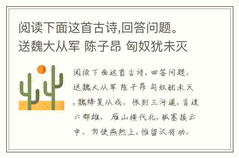 《送魏大从军》是一首充满壮志豪情的赠别诗,陈子昂通过多个历史典故与雄奇意象,将个人离情升华为家国大义。以下是对选项的具体分析: