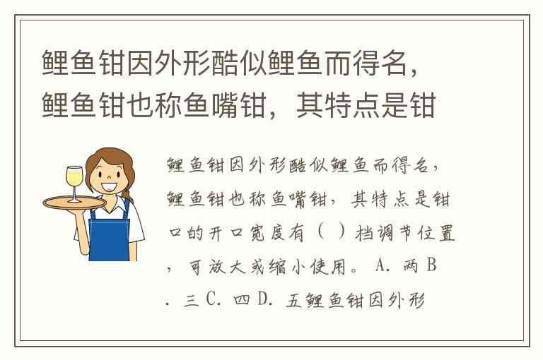 鲤鱼钳因外形酷似鲤鱼而得名,鲤鱼钳也称鱼嘴钳,其特点是钳口的开口宽度有( )档调节位置,可放大或缩小使用。 A. 两 B. 三 C. 四 D. 五