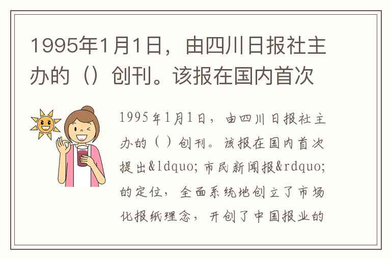 1995年1月1日,由四川日报社主办的()创刊。该报在国内首次提出“市民新闻报”的定位,全面系统地创立了市场化报纸理念,开创了中国报业的“都市报时代”。A.《文摘周报》 B.《成都商报》 C.《华西都市报》 D.《成都晚报》