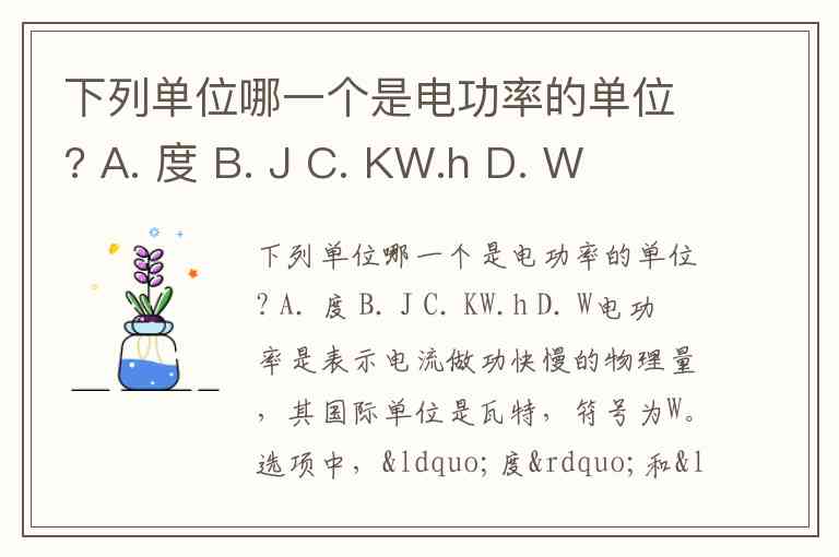 下列单位哪一个是电功率的单位? A. 度 B. J C. KW.h D. W