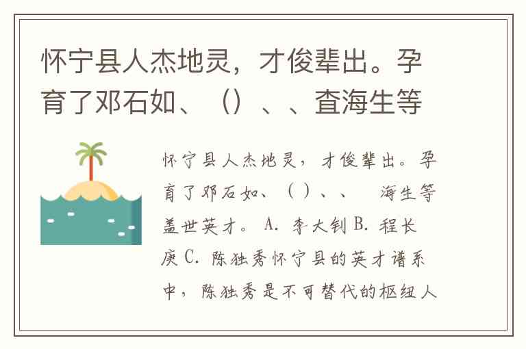 怀宁县人杰地灵,才俊辈出。孕育了邓石如、()、、査海生等盖世英才。 A. 李大钊 B. 程长庚 C. 陈独秀