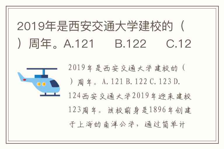 2019年是西安交通大学建校的()周年。A.121 B.122 C.123 D.124