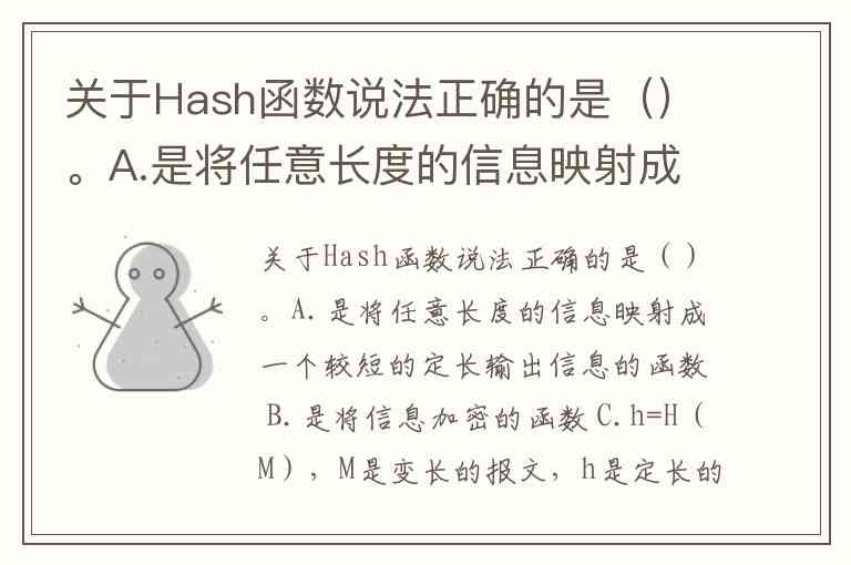 关于Hash函数说法正确的是()。A.是将任意长度的信息映射成一个较短的定长输出信息的函数 B.是将信息加密的函数 C.h=H(M),M是变长的报文,h是定长的散列值 D.h=H(M),M是变长的报文,h是不定长的散列值