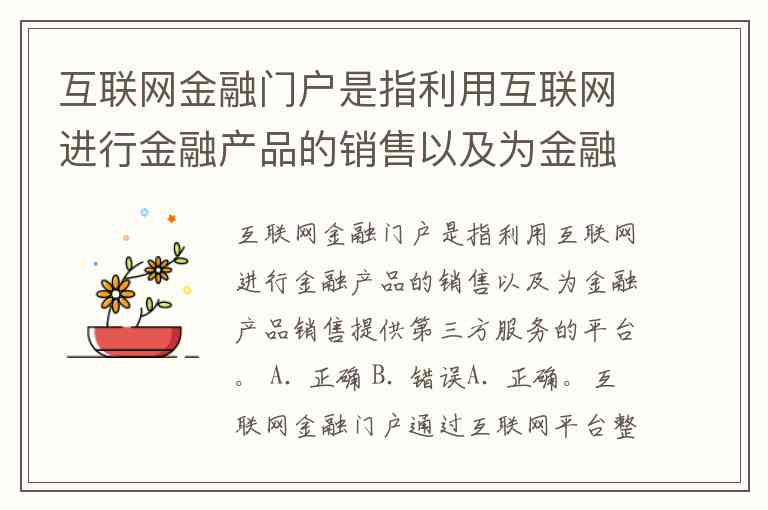 互联网金融门户是指利用互联网进行金融产品的销售以及为金融产品销售提供第三方服务的平台。 A. 正确 B. 错误