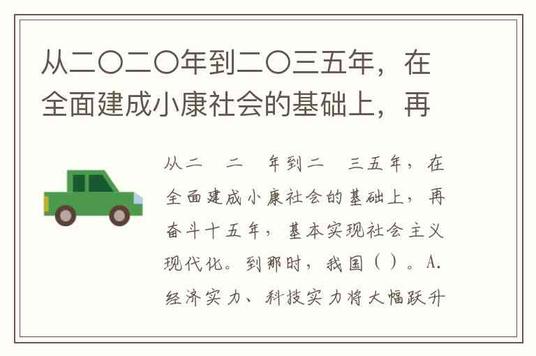 从二〇二〇年到二〇三五年,在全面建成小康社会的基础上,再奋斗十五年,基本实现社会主义现代化。到那时,我国()。A.经济实力、科技实力将大幅跃升,跻身创新型国家前列 B.人民平等参与、平等发展权利得到充分保障,法治国家、法治政府、法治社会基本建成,各方面制度更加完善,国家治理体系和治理能力现代化基本实现 C.社会文明程度达到新的高度,国家文化软实力显著增强,中华文化影响更加广泛深入 D.人民生活更为宽裕,中等收入群体比例明显提高,城乡区域发展差距和居民生活水平差距显著缩小,基本公共服务均等化基本实现,全体人民共同富裕迈出坚实步伐