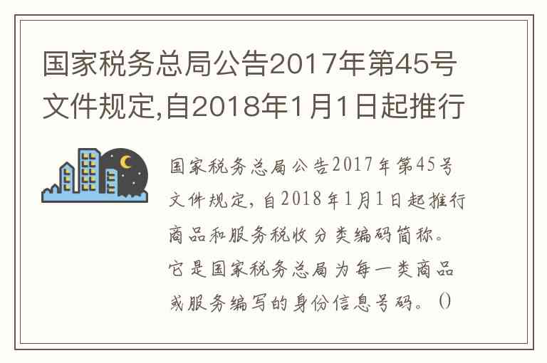 国家税务总局公告2017年第45号文件规定,自2018年1月1日起推行商品和服务税收分类编码简称。它是国家税务总局为每一类商品或服务编写的身份信息号码。() A. 正确 B. 错误