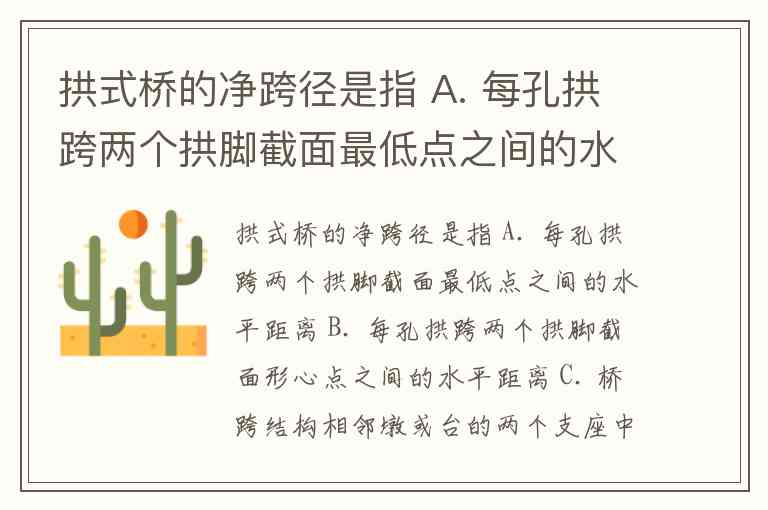 拱式桥的净跨径是指每孔拱跨两个拱脚截面最低点之间的水平距离,对应选项A。这一定义在桥梁工程术语中有明确界定,其核心要素包含三个关键信息:拱脚截面(而非支座或墩台)、最低点(区别于形心或内边缘)、水平距离(排除直线距离或垂直高度)。