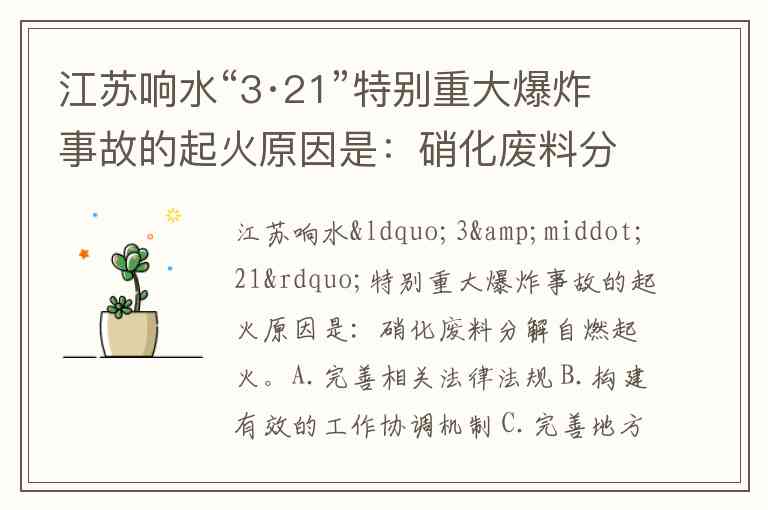 江苏响水“3·21”特别重大爆炸事故的起火原因是:硝化废料分解自燃起火。A.完善相关法律法规 B.构建有效的工作协调机制 C.完善地方安全治理制度 D.推进危化行业风险监测的信息化