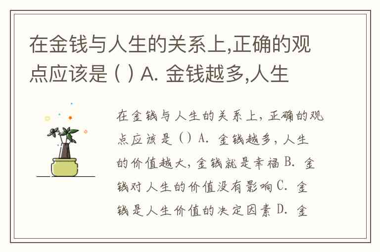 在金钱与人生的关系上,正确的观点应该是 ( ) A. 金钱越多,人生的价值越大,金钱就是幸福 B. 金钱对人生的价值没有影响 C. 金钱是人生价值的决定因素 D. 金钱是实现人生价值的重要条件