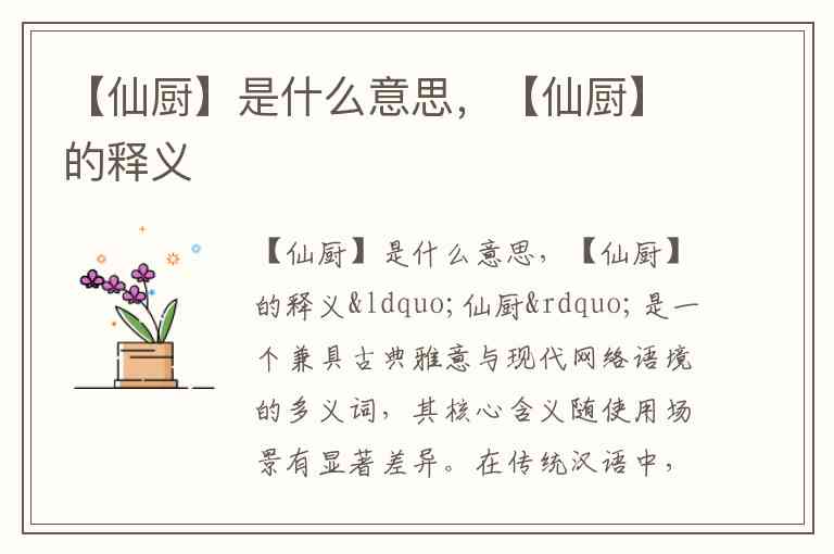 在实际使用中,若涉及历史、宫廷文化,“仙厨”几乎无例外地指向皇家御厨;若出现在动漫、游戏社区,则需警惕是否为“XX厨”的衍生用法。你更倾向于在哪个场景中使用这个词呢?