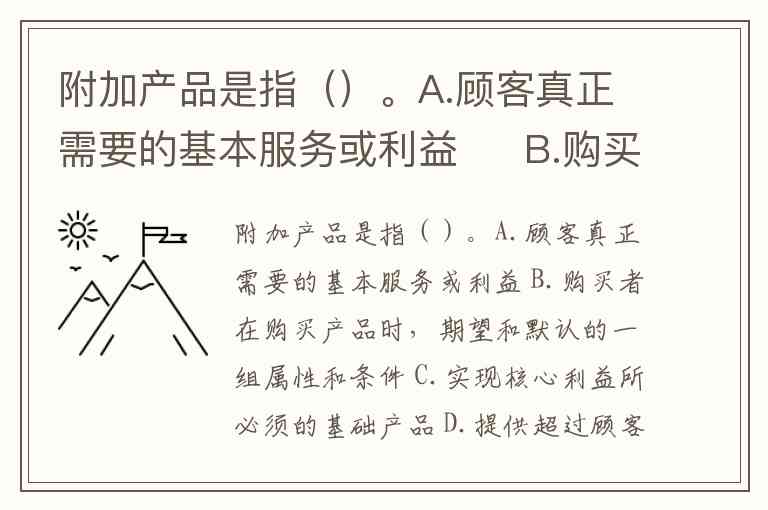 附加产品是指()。A.顾客真正需要的基本服务或利益 B.购买者在购买产品时,期望和默认的一组属性和条件 C.实现核心利益所必须的基础产品 D.提供超过顾客期望的服务或利益