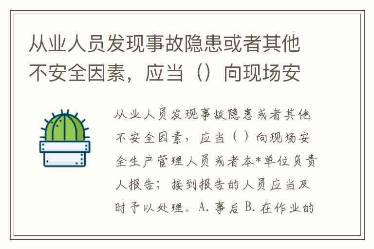 从业人员发现事故隐患或者其他不安全因素,应当()向现场安全生产管理人员或者本*单位负责人报告;接到报告的人员应当及时予以处理。A.事后 B.在作业的同时 C.立即