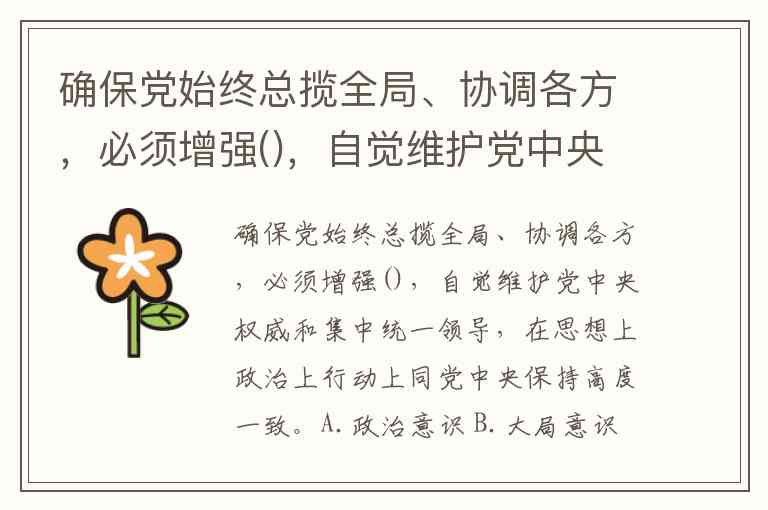 确保党始终总揽全局、协调各方,必须增强(),自觉维护党中央权威和集中统一领导,在思想上政治上行动上同党中央保持高度一致。A.政治意识 B.大局意识 C.核心意识 D.看齐意识