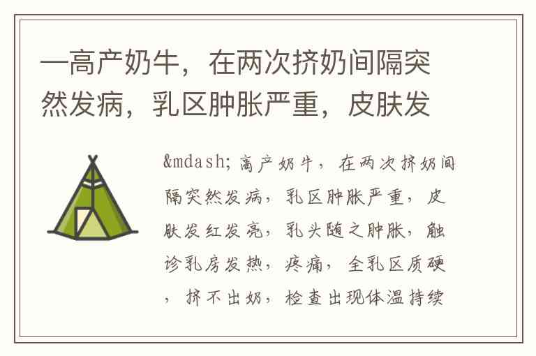 —高产奶牛,在两次挤奶间隔突然发病,乳区肿胀严重,皮肤发红发亮,乳头随之肿胀,触诊乳房发热,疼痛,全乳区质硬,挤不出奶,检查出现体温持续升高,食欲减少,喜卧。该病最有可能是( )A.慢性乳腺炎 B.隐性乳腺炎 C.轻度临诊型乳腺炎 D.重度临诊型乳腺炎 E.急性全身性乳腺炎