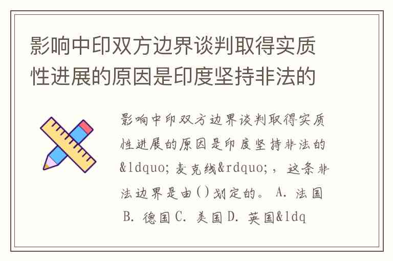 影响中印双方边界谈判取得实质性进展的原因是印度坚持非法的“麦克线”,这条非法边界是由( )划定的。 A. 法国 B. 德国 C. 美国 D. 英国