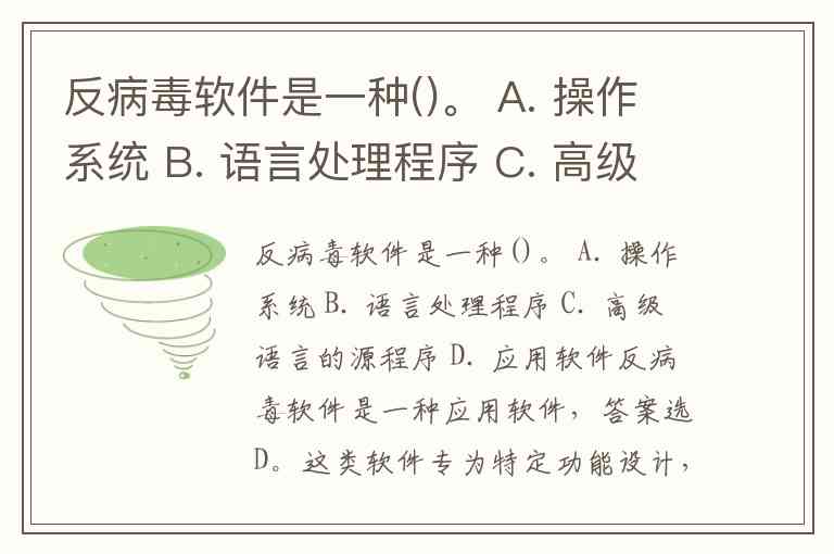 反病毒软件是一种()。 A. 操作系统 B. 语言处理程序 C. 高级语言的源程序 D. 应用软件