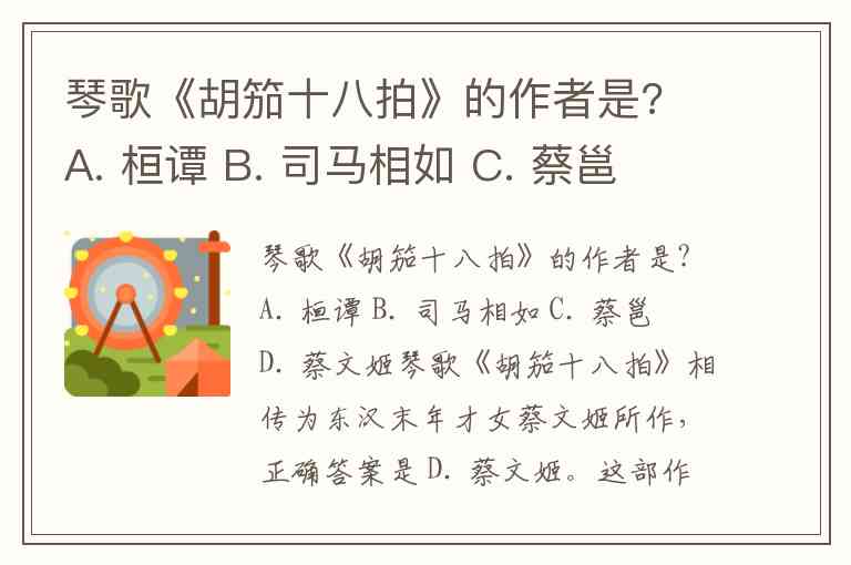 琴歌《胡笳十八拍》的作者是? A. 桓谭 B. 司马相如 C. 蔡邕 D. 蔡文姬