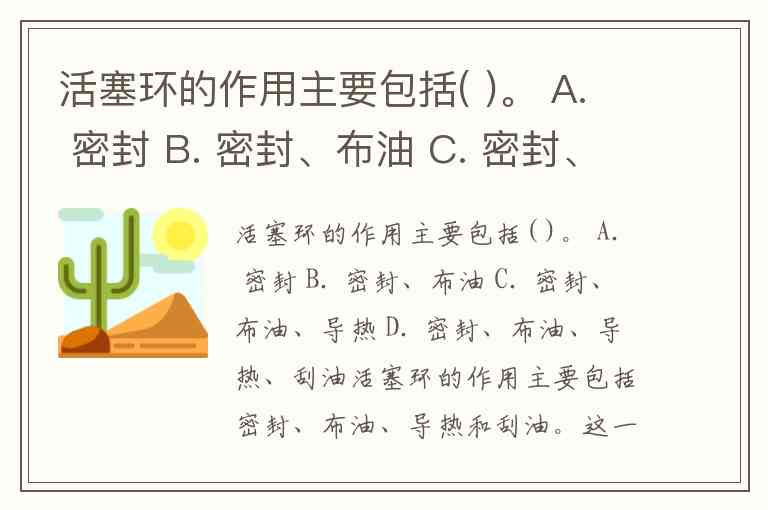 活塞环的作用主要包括( )。 A. 密封 B. 密封、布油 C. 密封、布油、导热 D. 密封、布油、导热、刮油