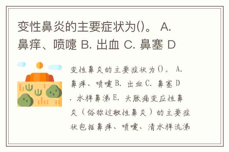 变性鼻炎的主要症状为()。 A. 鼻痒、喷嚏 B. 出血 C. 鼻塞 D. 水样鼻涕 E. 头胀痛