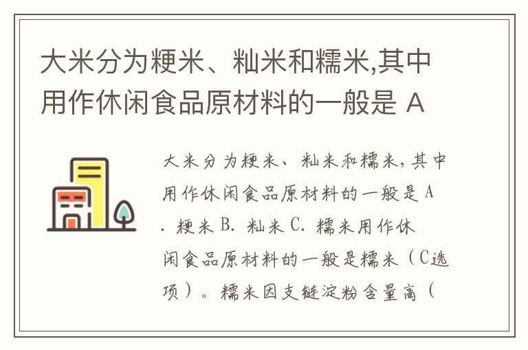 大米分为粳米、籼米和糯米,其中用作休闲食品原材料的一般是 A. 粳米 B. 籼米 C. 糯米