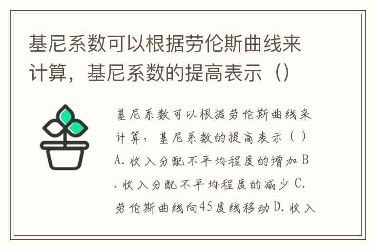基尼系数可以根据劳伦斯曲线来计算,基尼系数的提高表示()A.收入分配不平均程度的增加 B.收入分配不平均程度的减少 C.劳伦斯曲线向45度线移动 D.收入分配不平均程度没有改变
