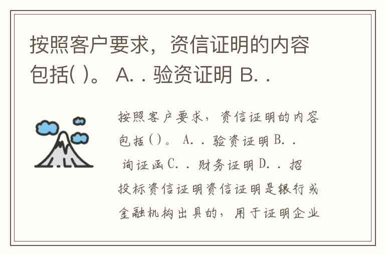按照客户要求,资信证明的内容包括( )。 A. . 验资证明 B. . 询证函 C. . 财务证明 D. . 招投标资信证明