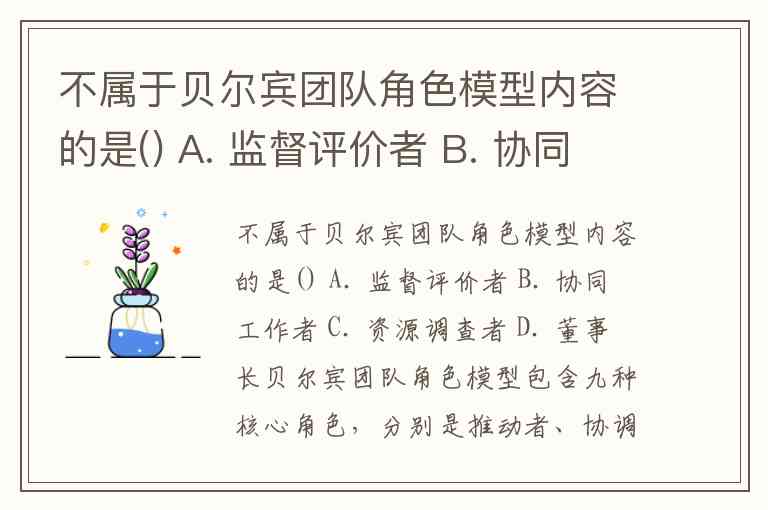 不属于贝尔宾团队角色模型内容的是() A. 监督评价者 B. 协同工作者 C. 资源调查者 D. 董事长