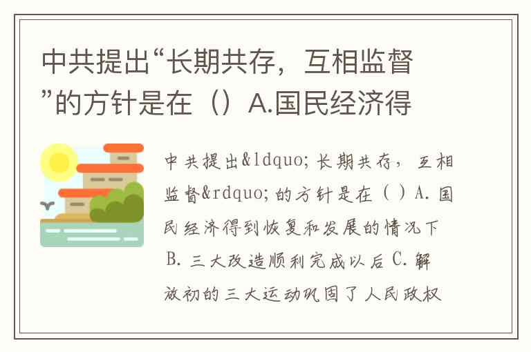 中共提出“长期共存,互相监督”的方针是在()A.国民经济得到恢复和发展的情况下 B.三大改造顺利完成以后 C.解放初的三大运动巩固了人民政权以后 D.“文化大革命”结束,十一届三中全会以后