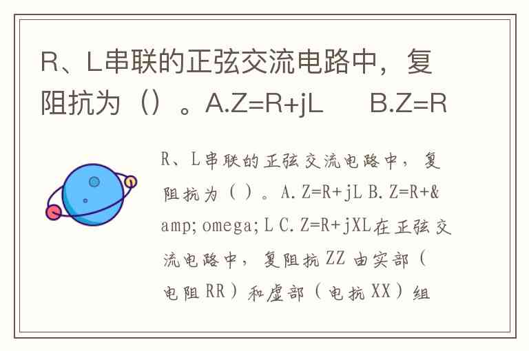 R、L串联的正弦交流电路中,复阻抗为()。A.Z=R+jL B.Z=R+ωL C.Z=R+jXL