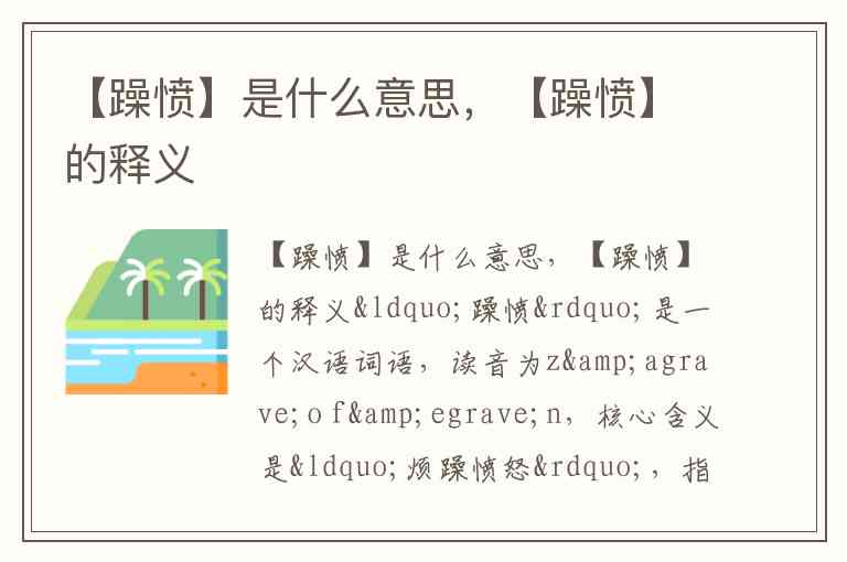 “躁愤”是一个汉语词语,读音为zào fèn,核心含义是“烦躁愤怒”,指因内心焦躁不安而产生的愤怒情绪。它由“躁”和“愤”两个字构成:“躁”表示性急、不冷静,如“躁动”“急躁”;“愤”表示因不满而产生的忿怒或怨恨,如“气愤”“愤怒”。这种情绪组合常体现为内心焦灼与外在愤怒的交织状态。