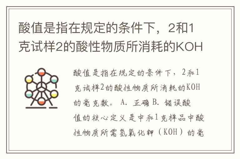 酸值的核心定义是中和1克样品中酸性物质所需氢氧化钾(KOH)的毫克数,而非题目中提到的“2克试样”。这一指标广泛用于油脂、石油产品、涂料等领域,反映样品中游离脂肪酸或酸性成分的含量,单位以 mg KOH/g 表示。例如,食品标准明确规定酸值是针对1克脂肪或油脂样品的测定结果,而石油产品酸值测试同样遵循“每克样品”的基准。题目中“2克试样”的表述与所有权威定义冲突,因此该说法错误。