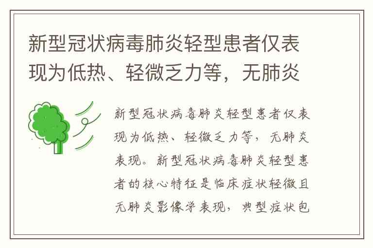 新型冠状病毒肺炎轻型患者仅表现为低热、轻微乏力等,无肺炎表现。