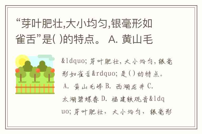 “芽叶肥壮,大小均匀,银毫形如雀舌”是( )的特点。 A. 黄山毛峰 B. 西湖龙井 C. 太湖碧螺春 D. 福建铁观音