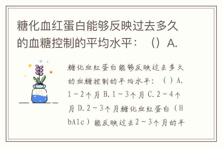 从医学证据来看,多数权威资料(包括2025年最新发布的健康科普和检验中心指南)明确支持“2~3个月”这一结论。例如,有文献指出糖化血红蛋白“可稳定可靠地反映出检测前120天内的平均血糖水平”,但结合红细胞更新动力学,临床解读时通常简化为2~3个月。相比之下,“1~2个月”(选项A)或“1~3个月”(选项B)的表述可能混淆了糖化血红蛋白与糖化白蛋白(反映2~3周血糖)的时间窗差异。