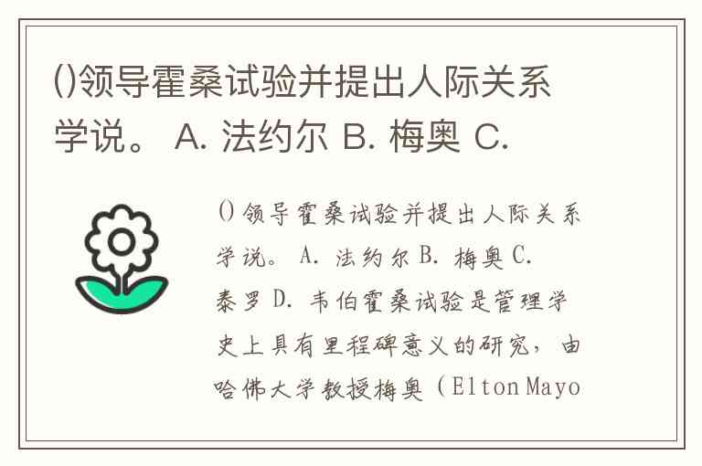 ()领导霍桑试验并提出人际关系学说。 A. 法约尔 B. 梅奥 C. 泰罗 D. 韦伯