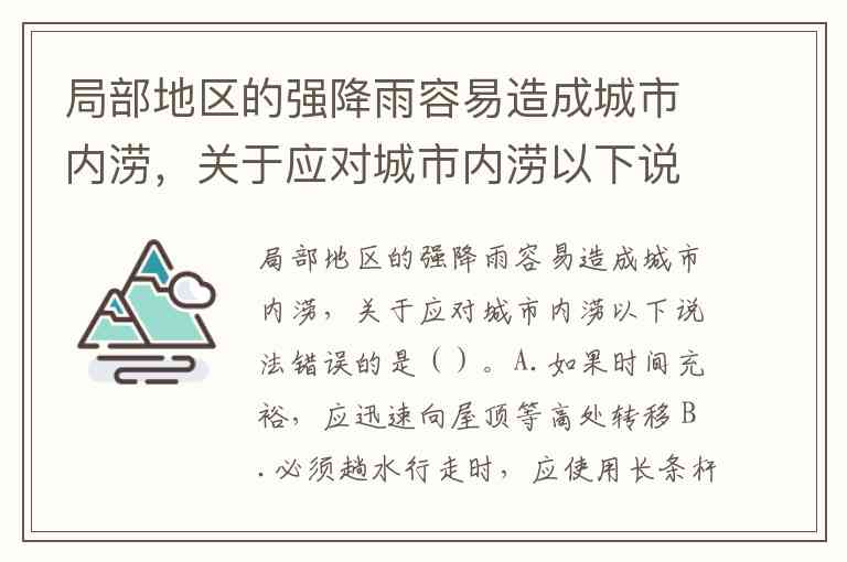局部地区的强降雨容易造成城市内涝,关于应对城市内涝以下说法错误的是()。A.如果时间充裕,应迅速向屋顶等高处转移 B.必须趟水行走时,应使用长条杆状物探路,以防陷入低洼或盖井松动的危险地段 C.步行时发现高压线铁塔倾倒、电线低垂或断折等,一定要远离避险,切不可触摸或接近 D.开车出行误入较深的积水区时,应在车里耐心等待救援