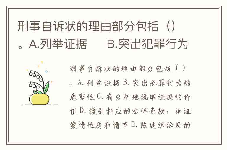 刑事自诉状的理由部分包括()。A.列举证据 B.突出犯罪行为的危害性 C.有分析地说明证据的价值 D.援引相应的法律条款,论证案情性质和情节 E.陈述诉讼目的和要求