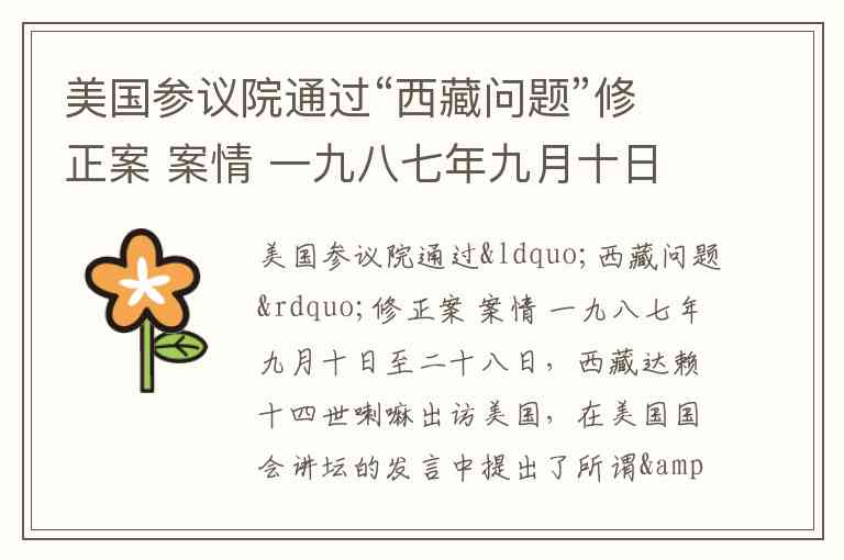 美国参议院通过“西藏问题”修正案 案情 一九八七年九月十日至二十八日,西藏达赖十四世喇嘛出访美国,在美国国会讲坛的发言中提出了所谓'五点和平建议': 一、使整个西藏变成一个和平区。建议把整个西藏,包括昌都地区和青海省藏区,变成和平区。......西藏历来是......亚洲大陆大国之间的缓冲国。......要建立西藏和平区,中国就得把其军队和军事设施从这个国家撤走。 二、中国放弃向西藏地区移植人口政策,因为这威胁着西藏民族的根本生存。 三、尊重西藏人民的根本人权和民主权利。西藏是世界上侵犯人权最严重的地区之一。中国人在那里推行一种称为分离和同化的种族隔离政策,对藏民实行歧视,藏民在自己的国家里充其量只不过是二等居民。他们在殖民政府的统治下生活,被剥夺了一切基本权利和自由。 四、恢复和保护西藏的自然环境和中国放弃在西藏生产核武器和堆放核废料计划。 五、就西藏未来的地位以及西藏人民和中国人民之间的关系问题举行诚挚的谈判。我们希望本着坦率与和解的精神,通情达理和实事求是地处理这个问题,着眼点应该是努力寻找一种符合藏人、中国人和其它所有有关民族长远利益的解决办法。藏人和汉人都是独特的民族......但是,这不一定妨碍两个民族在符合双方共同利益的方面进行真正的合作。 为了支持达赖'五点和平建议',美国参议院外交委员会主席赫尔姆斯与参议院前外交委员会主席佩尔,提出'西藏问题修正案',诬蔑中国'在西藏侵犯人权',歪曲拉萨骚乱事件,造谣中国处决和监禁了一百多万藏人,还散布西藏是'国家'的谬论。这个决议还要求美国将其对华外交与人权问题联系起来。要求里根当局在向国会提出向中国出售武器请求时,要能'判定中国是否有诚意地,及时地着手解决西藏的人权问题'。决议还呼吁里根会见达赖,建议美国向十万藏民提供二十万美元的援助。 问题 请分析,美国参议院通过 “西藏问题“修正案是否违反国际法? 为什么?A......西藏历来是......亚洲大陆大国之间的缓冲国。......要建立西藏和平区,中国就得把其军队和军事设施从这个国家撤走。 二、中国放弃向西藏地区移植人口政策,因为这威胁着西藏民族的根本生存。 三、尊重西藏人民的根本人权和民主权利。西藏是世界上侵犯人权最严重的地区之一。中国人在那里推行一种称为分离和同化的种族隔离政策,对藏民实行歧视,藏民在自己的国家里充其量只不过是二等居民。他们在殖民政府的统治下生活,被剥夺了一切基本权利和自由。 B......但是,这不一定妨碍两个民族在符合双方共同利益的方面进行真正的合作。