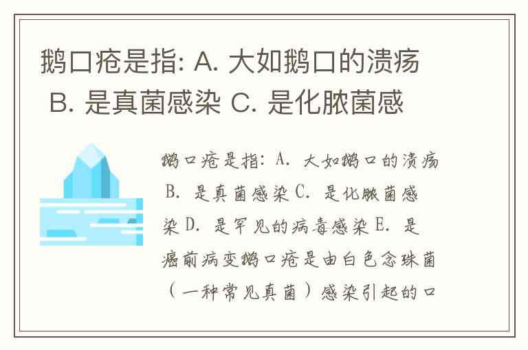 这一结论可通过多份权威资料交叉验证:所有医学定义文档均明确指出鹅口疮的病原体为白色念珠菌(真菌),而选项A描述的"大如鹅口的溃疡"实为民间误称,鹅口疮的典型特征是白色斑膜而非溃疡;选项C、D提及的细菌或病毒感染与病因完全不符;选项E将其归为癌前病变更是无依据,临床显示鹅口疮经抗真菌治疗(如制霉菌素混悬液)后可治愈,预后良好。