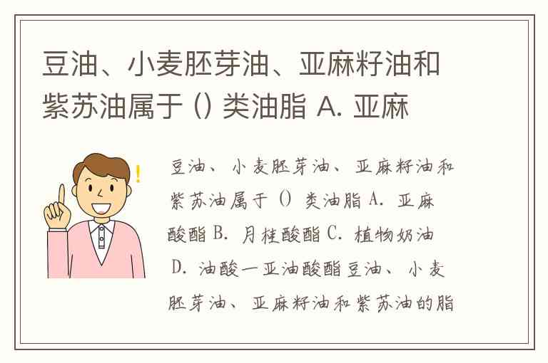 答案:A(亚麻酸酯)和D(油酸一亚油酸酯)需拆分判断。严格来说,豆油和小麦胚芽油属于D. 油酸一亚油酸酯(亚油酸为主,油酸为辅),亚麻籽油和紫苏油属于A. 亚麻酸酯。但题目将四种油合并归类,可能存在选项设计偏差。若单选题需选最接近的答案,D选项更符合整体特征(豆油和小麦胚芽油占比更高,且亚油酸酯是主流植物油类型)。